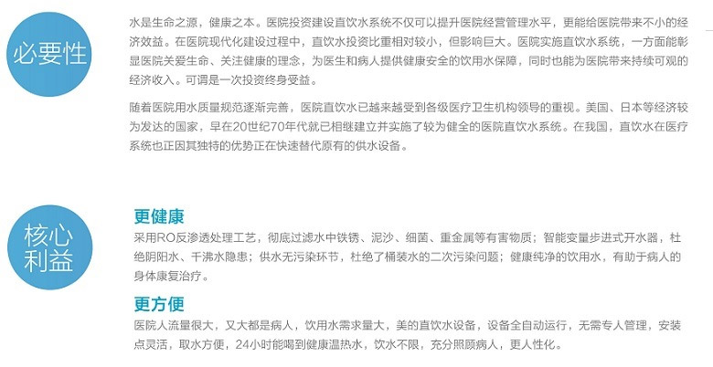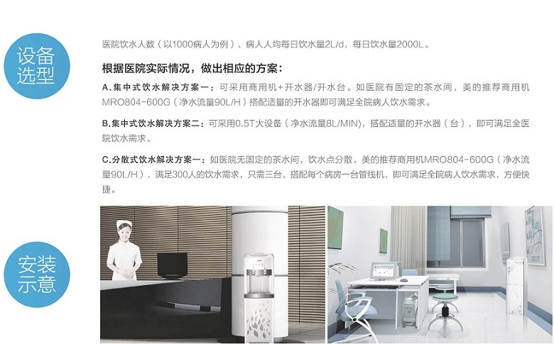 专为医务场所定制饮用水解决方案,保障病人和医护人员的饮用水安全,病人康复快,医生放心,家人舒心。
