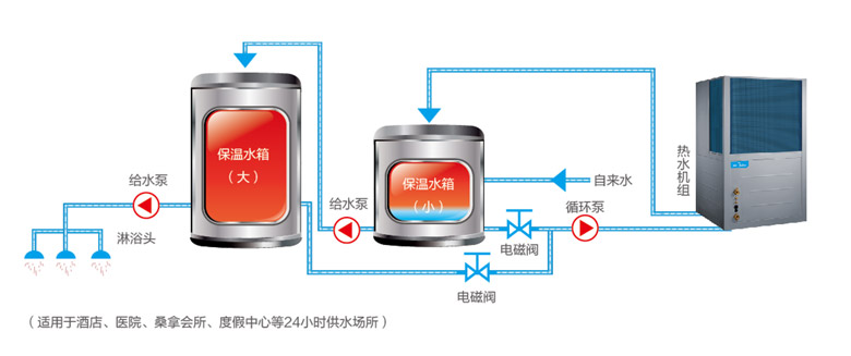 系统采用开式水箱时,可根据需求水量和温度分段设定时段的产水量,减少能耗和水箱散热。